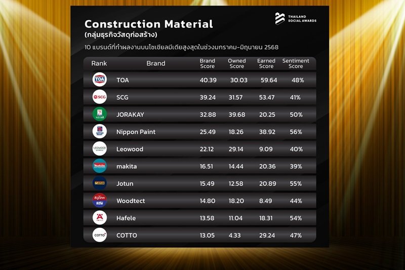 TOA คว้าอันดับ 1 แบรนด์ที่ทำผลงานบนโซเชียลมีเดียสูงสุดในกลุ่มธุรกิจวัสดุก่อสร้าง ในช่วงมกราคม – มิถุนายน 2568 โดย Thailand Social Awards