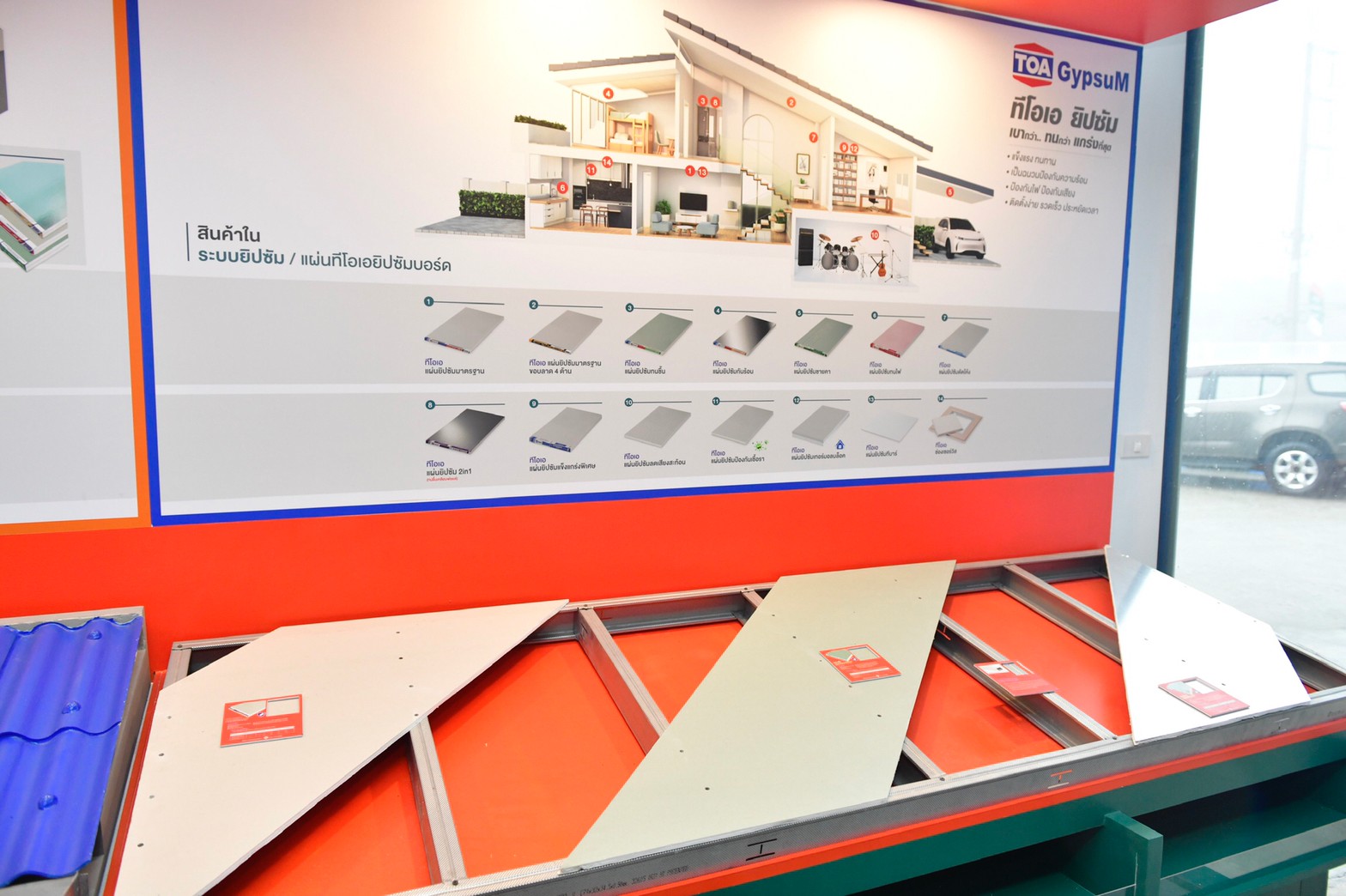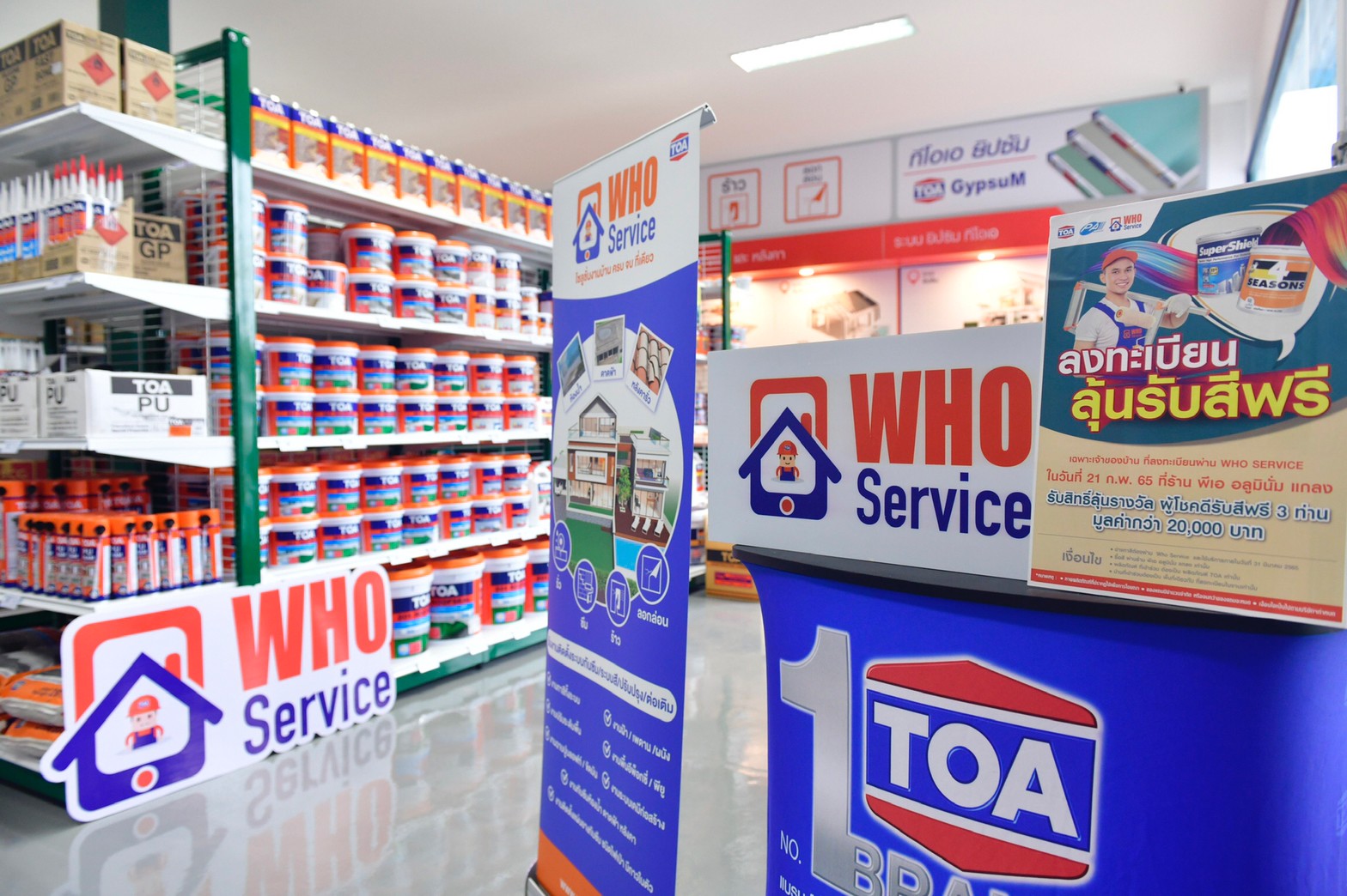 Mega Paint and Home ถือเป็นการปฏิวัติวงการสี เคมีภัณฑ์ก่อสร้าง กระเบื้องเซรามิค และวัสดุก่อสร้าง ยกระดับด้วยโซลูชั่นแบบครบวงจร (Total Solution) ที่จำหน่ายสินค้าประเภทสีทาอาคาร สีอุตสาหกรรม สีงานไม้ สินค้าฮาร์ดแวร์ เคมีภัณฑ์ก่อสร้าง เพื่อซ่อมแซมบ้าน และอาคารที่รั่ว ซึม ร้าว ลอกล่อน หรือจะเป็น การเสริมกำลังโครงสร้างสิ่งปลูกสร้างให้รับน้ำหนักได้มากขึ้นด้วยเทคโนโลยีจากประเทศเยอรมนี รวมถึงมียิปซั่มบอร์ดคุณภาพมาตรฐาน แบรนด์ “TOA Gypsum” และยังมีกระเบื้องเซรามิค กระเบื้องพอร์ซเลน อีกทั้งบริการงานช่างมาตรฐานใหม่ ที่เรียกว่า “WHO Service” โดยทีมช่างผู้รับเหมามืออาชีพ ที่ผ่านการฝึกอบรมจาก TOA เพื่อให้ลูกค้าเลือกใช้บริการได้อย่างมั่นใจ 100% ด้วยบริการครบทุกความต้องการ อาทิ ทาสีอาคาร ติดตั้งระบบกันซึมดาดฟ้า หลังคา ระบบกันซึมห้องน้ำและปูกระเบื้อง ระบบกันซึมด้วยแผ่นยางชนิดเป่าไฟ และแผ่นยางกันซึมชนิดมียางในตัว ติดตั้งฝ้าเพดานและผนัง พื้นโรงงานอุตสาหกรรม ซ่อมพื้น ปรับระดับพื้นอีพ็อกซี่ พื้นพียู และรับเหมางานฉาบปูนลอฟท์ ปูนฉาบขัดมันสำเร็จรูป ซึ่งปัจจุบัน WHO Service มีฐานผู้รับเหมาคุณภาพในระบบกว่า 300 บริษัท ทั่วประเทศ ที่พร้อมให้บริการลูกค้าอย่างใกล้ชิด