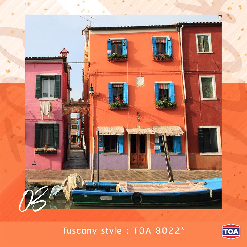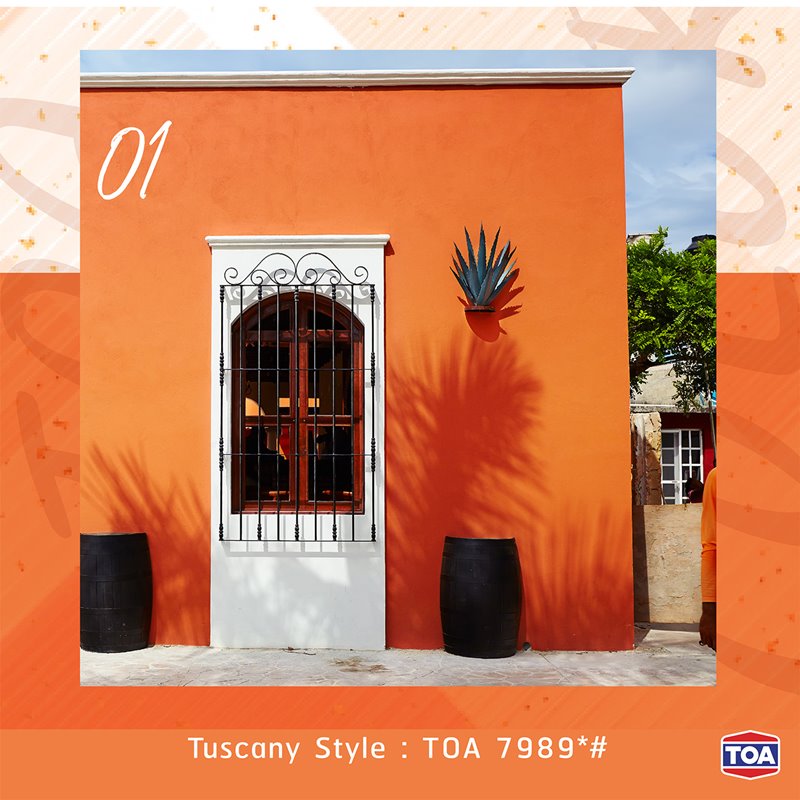 1. Tuscany Style บ้านสไตล์ทัสคานี แบบแซบๆ สีส้มสดใสรับอากาศร้อนๆแบบบ้านเรา ที่ได้แรงบันดาลใจจาก แคว้นทอสคานา ( Tuscany ) ในอิตาลี ทาอาคารด้วยสีส้ม TOA 7989*# ตัดขอบประตูด้วยสีขาว ผสมผสานอย่างลงตัวกับเหล็กดัดลวดลาย สีวินเทจ