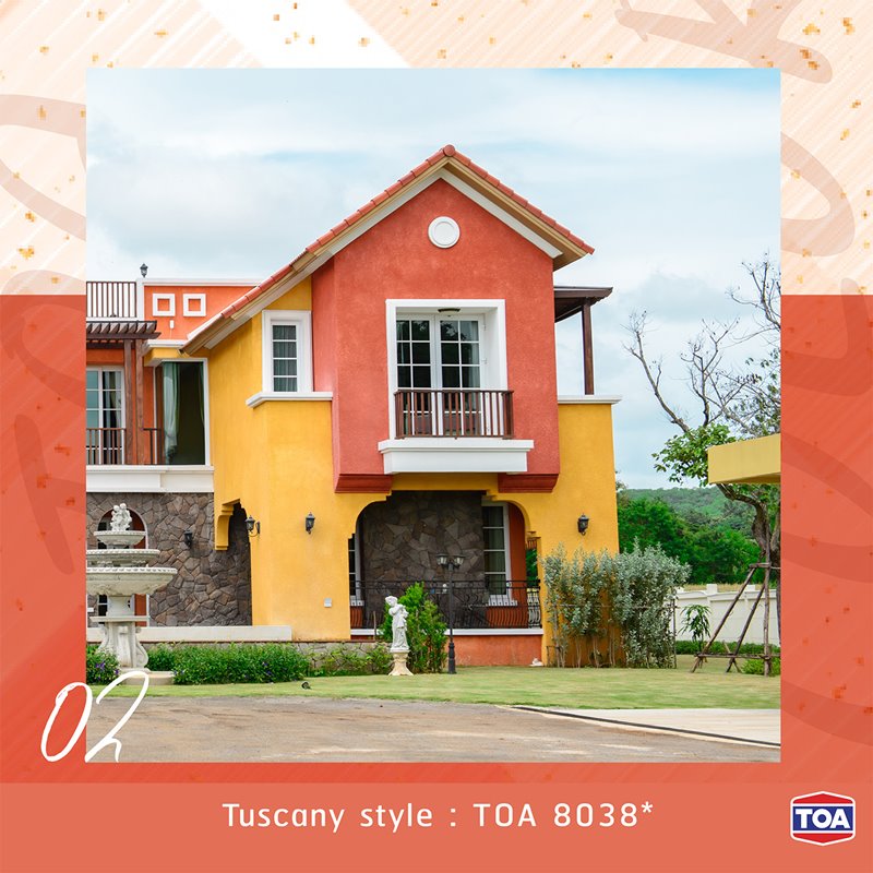 2. ยังอยู่กับบ้านสไตล์ทัสคานี สีส้ม แต่คราวนี้มาด้วยส้ม TOA 8038* ตัดกับอาคารสีเหลืองสว่างนวล TOA 7919* ตัดขอบบัวด้วยสีขาว และตกแต่งสวนโดยรอบด้วยประติมากรรมปูนปั้นต่างๆสไตล์อิตาลี ( Italian Garden )
