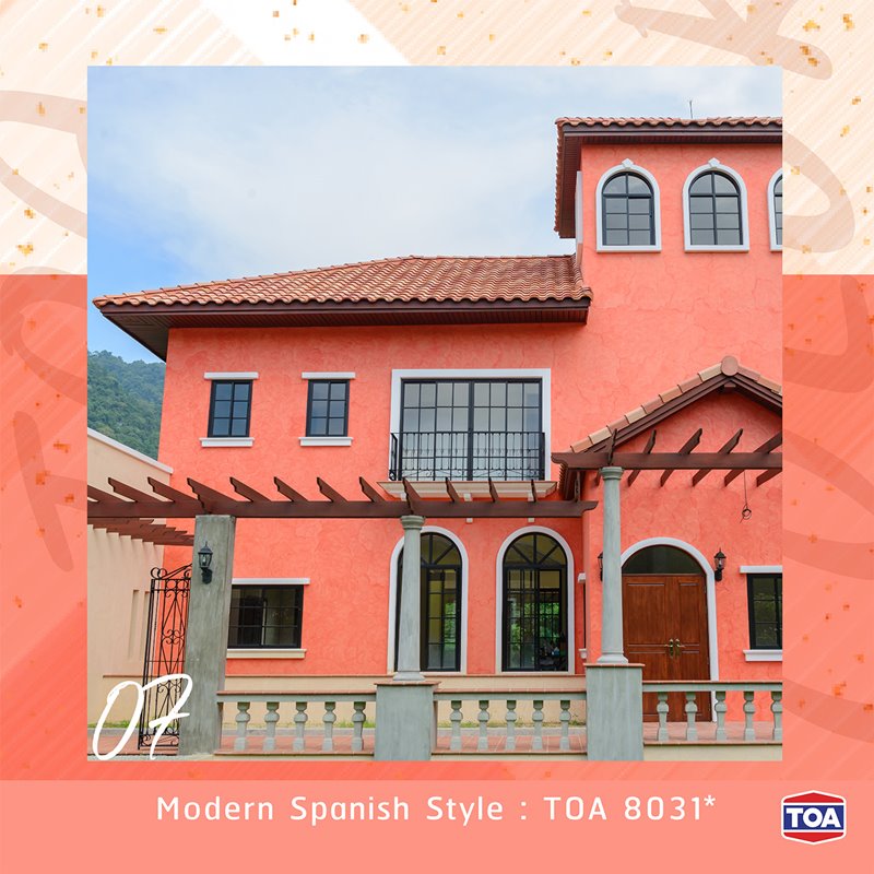 7. Modern Spanish Style สไตล์บ้านที่อยู่ในตระกูลเดียวกับTuscany Style อารมณ์บ้านบนเขา เลือกทาสีส้มอมชมพูแบบ TOA 8031* เพียงเท่านี้ ไม่ว่าอยู่มุมไหนของบ้าน ก็รู้สึกเหมือนท่องเที่ยวตลอดเวลาแล้วค่ะ