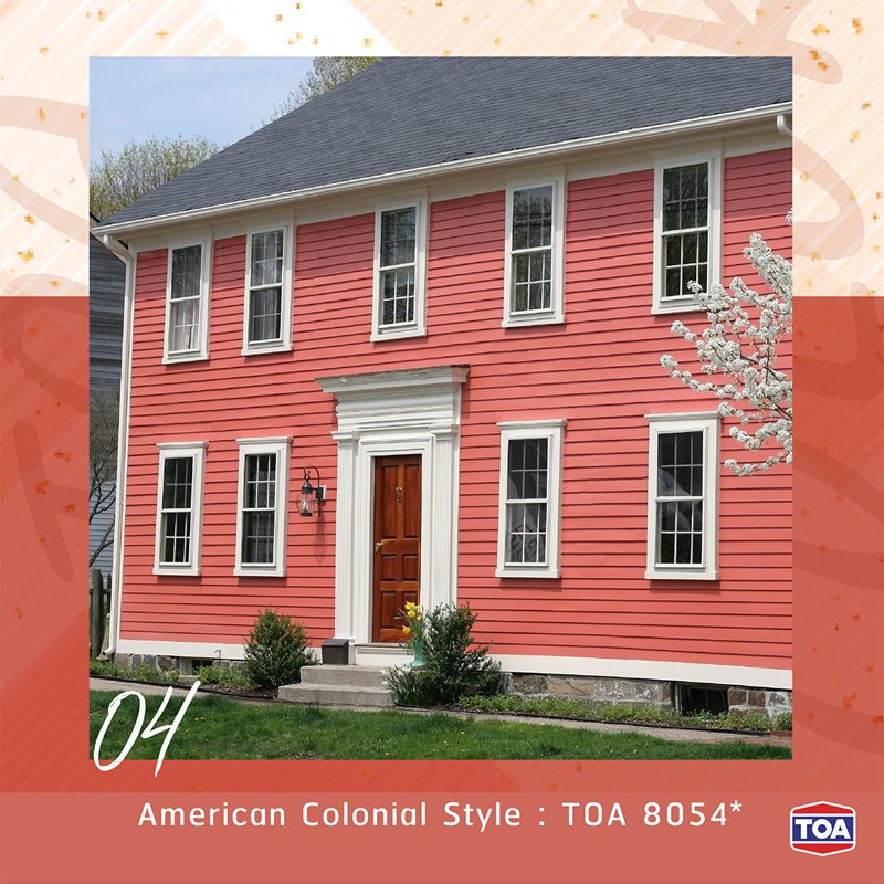 4. บ้านแบบ American Colonial ที่ถูกออกแบบอย่างสมมาตร ทั้งประตูและหน้าต่าง ใช้ไม้ฝาเป็นส่วนประกอบหลักในการตกแต่ง Facade เรียบง่ายแต่ดูดี เลือกใช้สีส้มหวานๆแบบ TOA 8054*