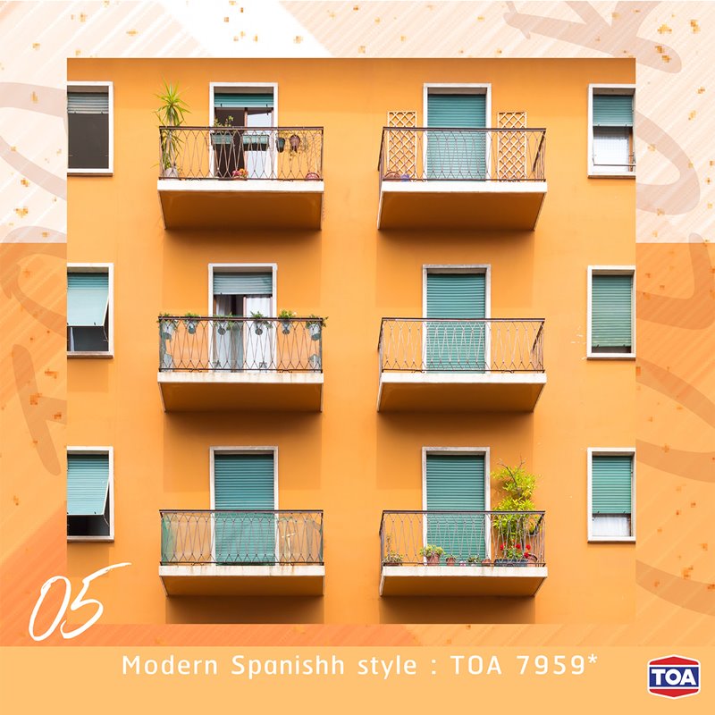 5. จะมีอะไรคูลไปกว่าการแต่งบ้านให้ดูเหมือนอยู่ต่างประเทศตลอดเวลา กับบ้านแบบ Modern Spanish ที่สามารถนำไอเดียมาใช้กับอาคารพาณิชย์ในบ้านเราได้ ด้วยตัวอาคารทรงกล่องแบบเรียบง่าย กรอบหน้าต่างตัดปูนบัวเป็นสันนูน แต่เลือกใช้เหล็กดัดเส้นบางดัดโค้งเป็นลวดลายสวยงาม ตกแต่งด้วยไม้เขตร้อนอย่าง อากาเว่ ( Agave ) และทาสี TOA 7959*