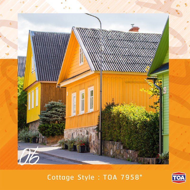 6. Cottage style บ้านสวยสไตล์รีสอร์ท บ้านหลังคาลาดเอียง มีห้องใต้หลังคา เพดานสูง เหมือนกระท่อมขนาดย่อม เหมาะกับการทาสีสันสดใส แนะนำ TOA 7958* สีส้มสดสว่างรับซัมเมอร์กันไปเลย