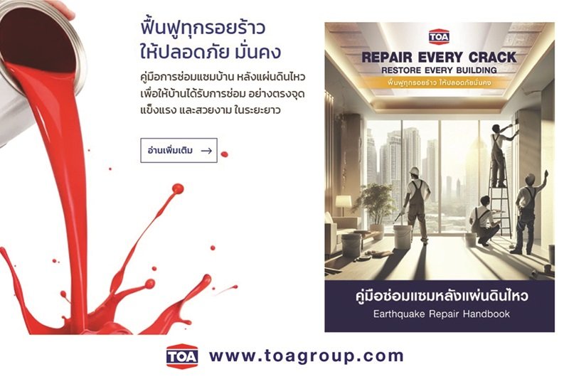 ทีโอเอ มุ่งมั่นช่วยเหลือประชาชนให้สามารถซ่อมแซมบ้านได้อย่างถูกต้องและปลอดภัยที่สุด เราจึงจัดทำคู่มือฉบับพิเศษ สำหรับประชาชนเพื่อเป็นแนวทางการซ่อมแซมหลังแผ่นดินไหว ตอบโจทย์ทุกปัญหารอยแตกร้าวทั้งขนาดเล็ก – รอยแตกลายงา, รอยแตกร้าวขนาดใหญ่ หรือรอยร้าวแนวเฉียงตามวงกบ, รอยร้าวผิวผนัง Precast, ผนังปูนหลุดล่อนขนาดใหญ่ (กรณีที่ไม่ได้เกิดจากโครงสร้าง), พื้นกระเบื้อง ผนังกระเบื้อง - แผ่นฝ้ายิปซัมหลุดล่อน ด้วยผลิตภัณฑ์และเคมีภัณฑ์ก่อสร้างคุณภาพสูง เช่น ทีโอเอ อะคริลิก ฟิลเลอร์, ทีโอเอ อะคริลิก ซีลแลนท์, ทีโอเอ โพลียูริเทน ซีลแลนท์, ทีโอเอ พียูโฟม สเปรย์, ทีโอเอ ซิลิโคน ซีลแลนท์ จีพี, ทีโอเอ 102 ดี โค้ท เป็นต้น สามารถดาวน์โหลดคู่มือฉบับเต็ม ได้ที่ https://www.toagroup.com/storage/downloads/toa-earthquake-repair-handbook.pdf หรือสอบถามรายละเอียดเพิ่มเติมได้ที่ TOA Call Center โทร. 02-335-7777 กด 1