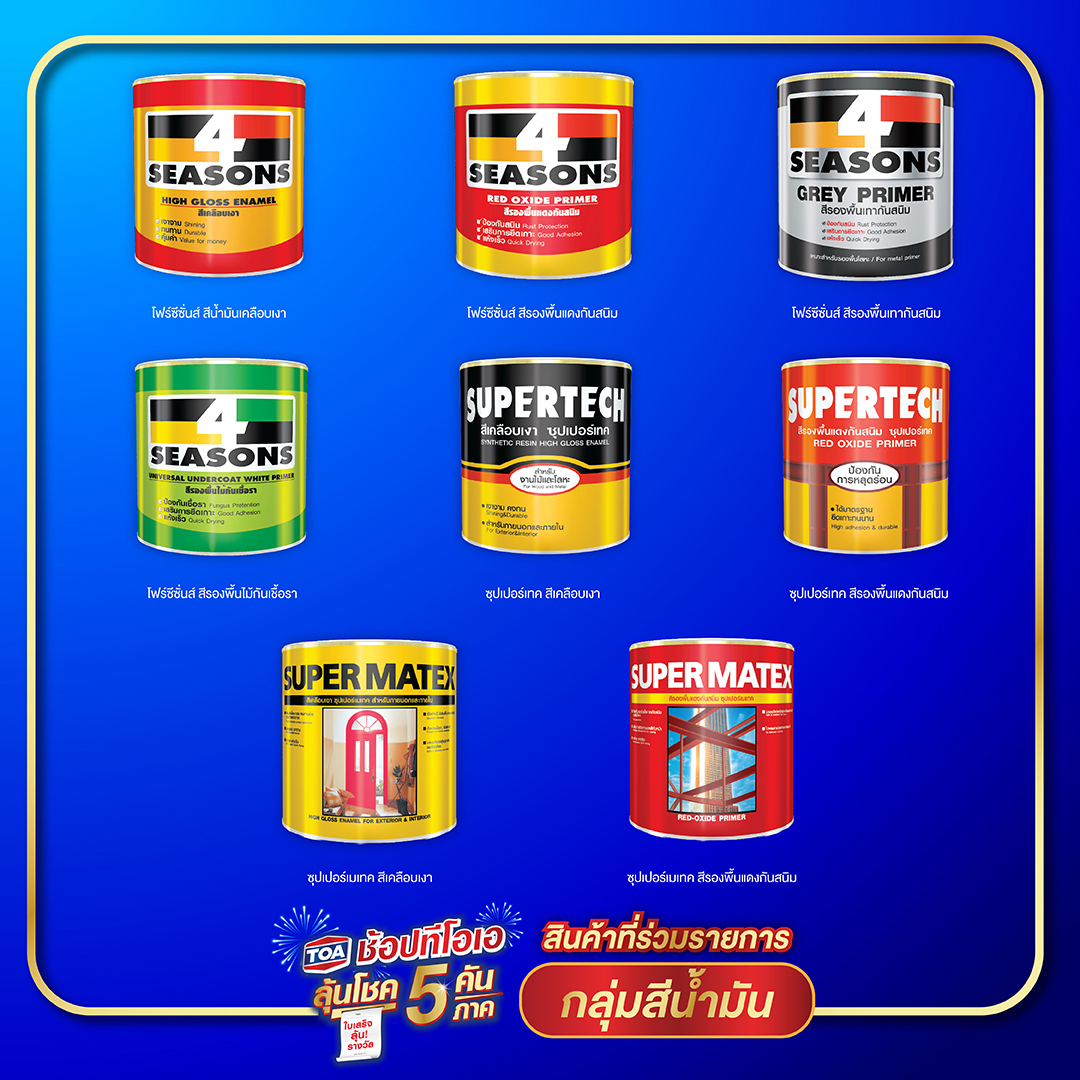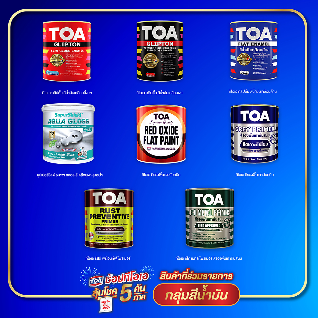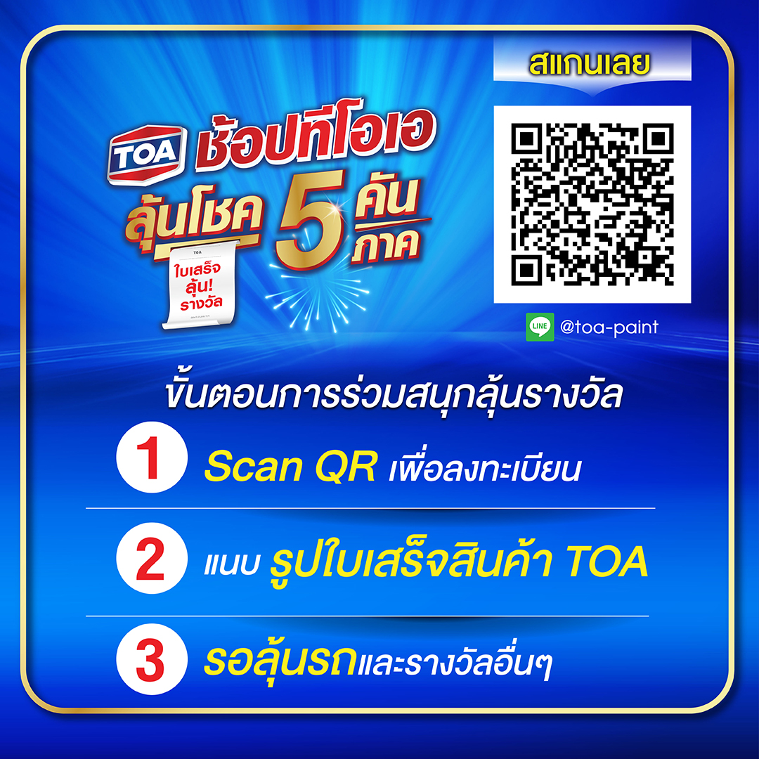 - ถ่ายรูปใบเสร็จ ส่งเข้า Line official account: @toa-paint เพื่อรับสิทธิลุ้นของรางวัลมากมาย